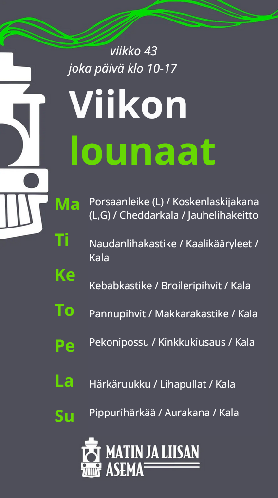 Lounas tarjotaan noutopöydästä joka päivä klo 10-17. Mahdollisuus nauttia myös kevyempi salaatti/keittolounas.